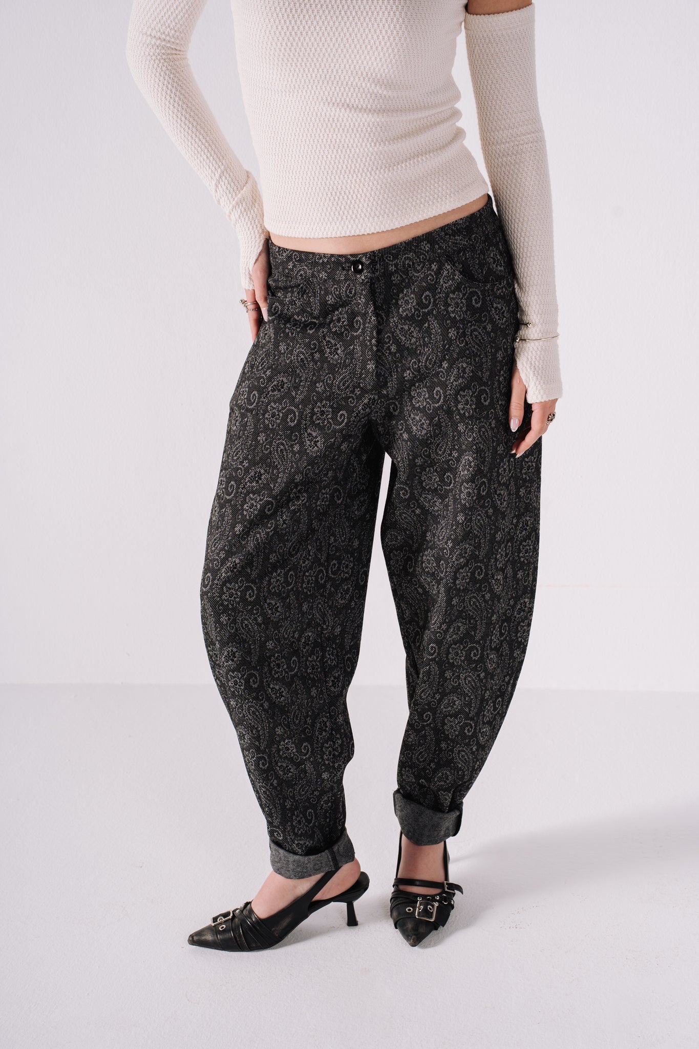 These flowing wide-leg pants feature a subtle, all-over paisley or floral print for a bohemian-inspired edge. Their relaxed fit and soft drape create an comfortable yet statement silhouette that's perfect for effortless styling.