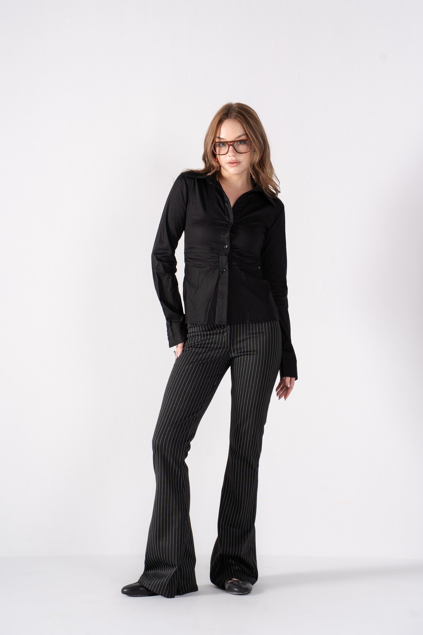 These elegant black flare pants feature a subtle, pinstripe texture that adds depth and sophistication. The perfectly tailored fit and dramatic flare at the hem create a stunningly long, retro-chic silhouette.