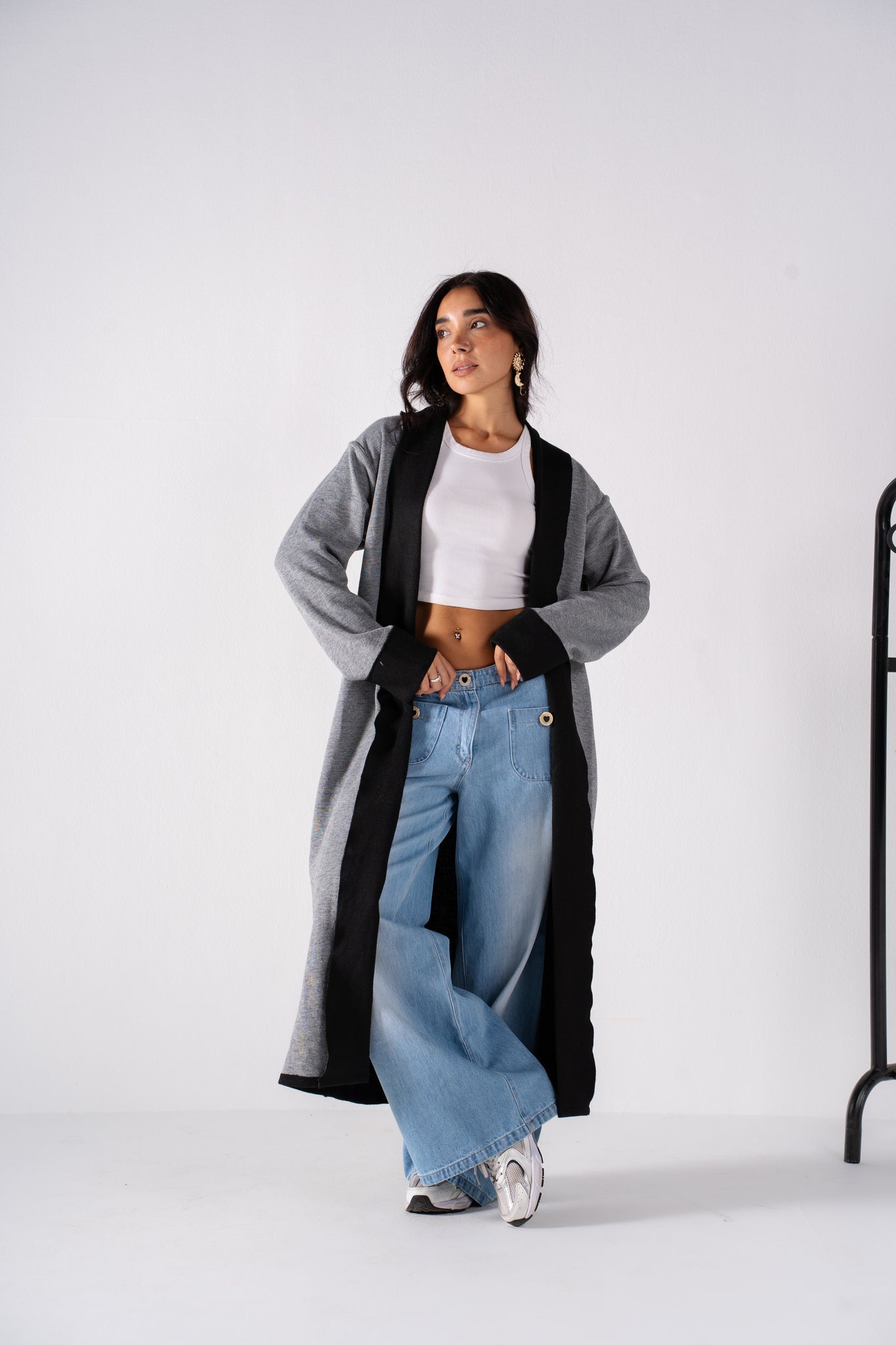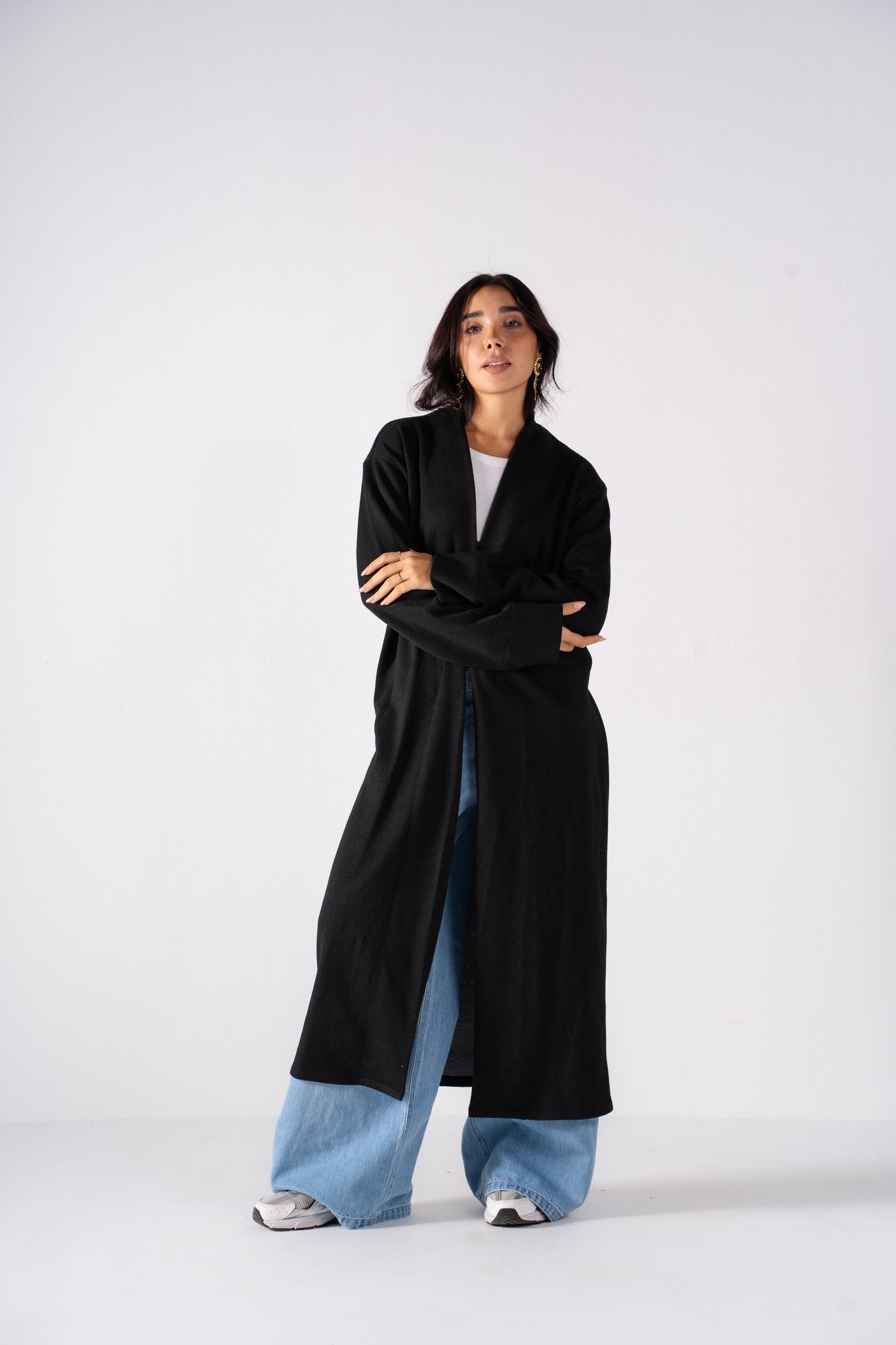 This long double-faced cardigan offers a cozy yet sophisticated layering piece with its generous length and soft texture. Its open front and relaxed silhouette make it an essential outerwear choice for an effortless, draped look.