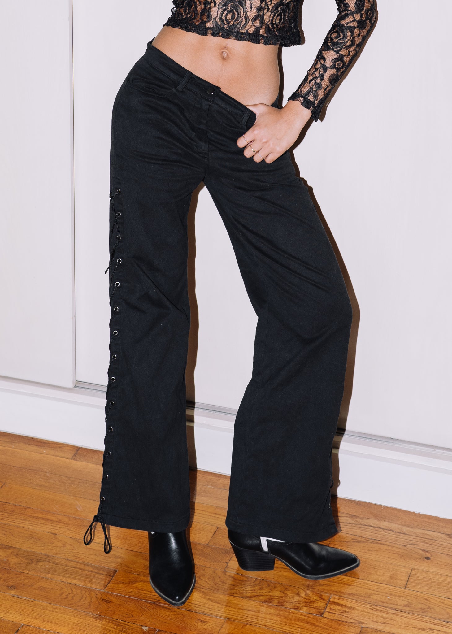 Black wide-leg pants with lace-up sides for a bold twist. Comfy yet edgy, perfect for standout styling.