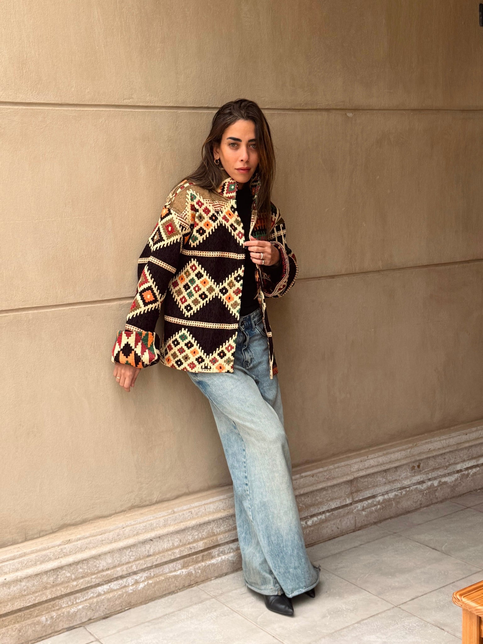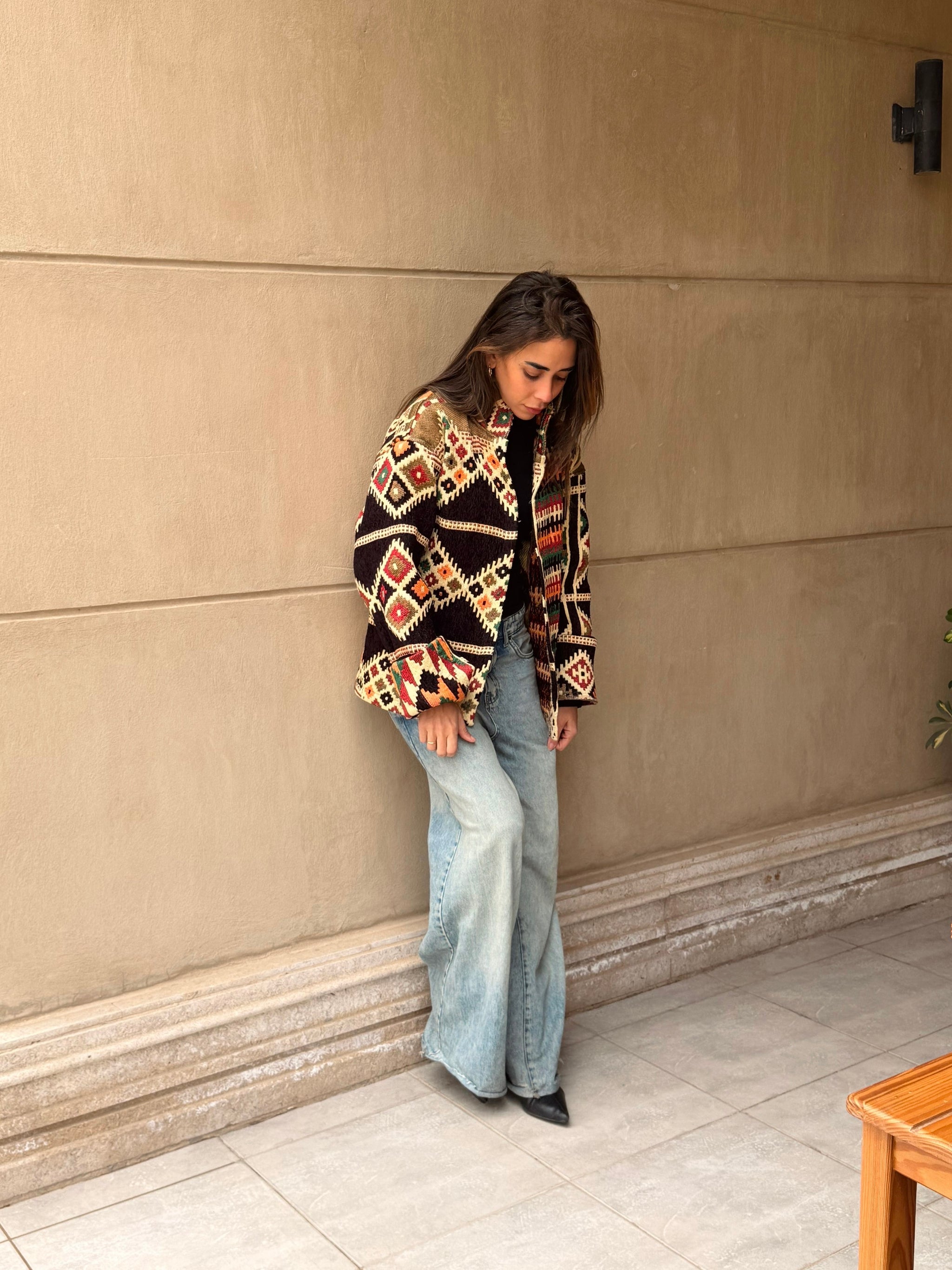 A statement jacket featuring a vibrant geometric pattern in shades of pink, olive, and warm neutrals. The structured silhouette and detailed woven fabric make it an easy standout piece that can be styled effortlessly with denim or neutral outfits.