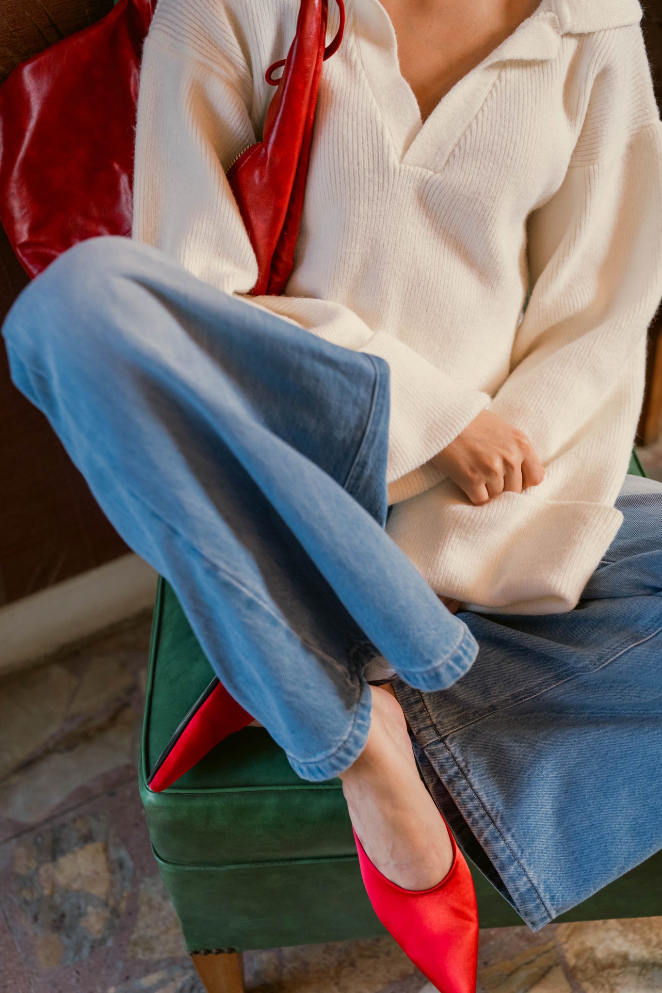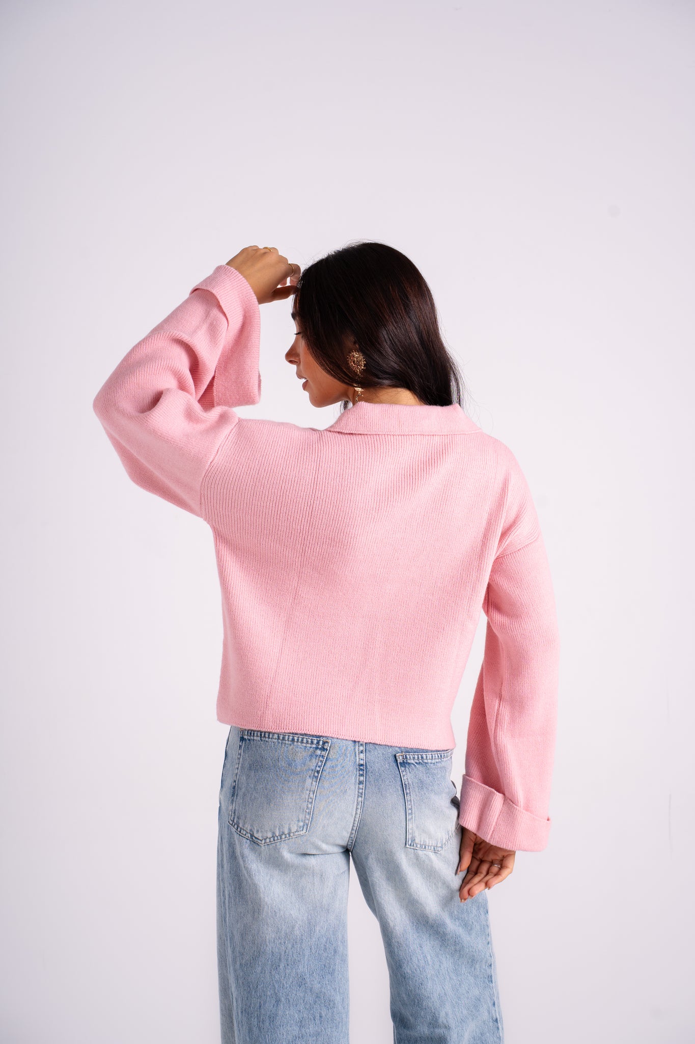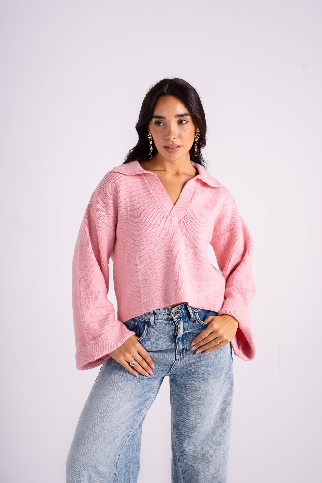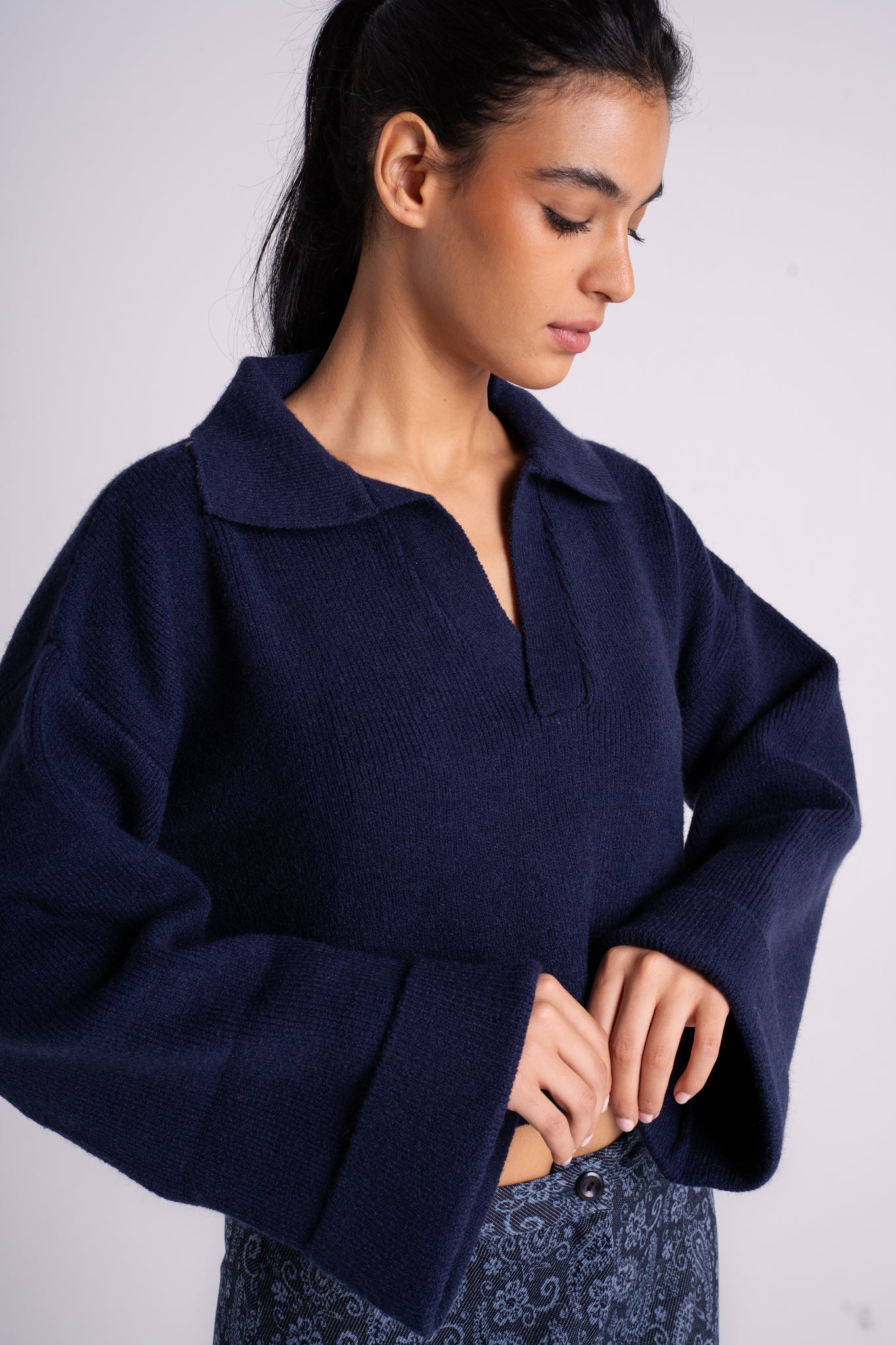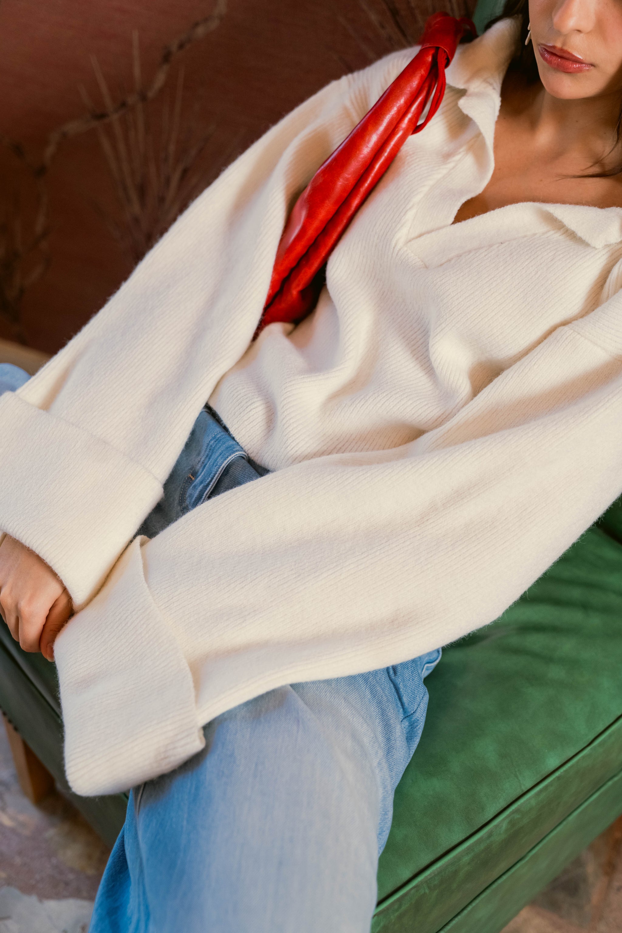 A relaxed yet refined knit with an open collar and statement wide sleeves. Effortlessly chic, it blends comfort with a modern, laid-back edge.