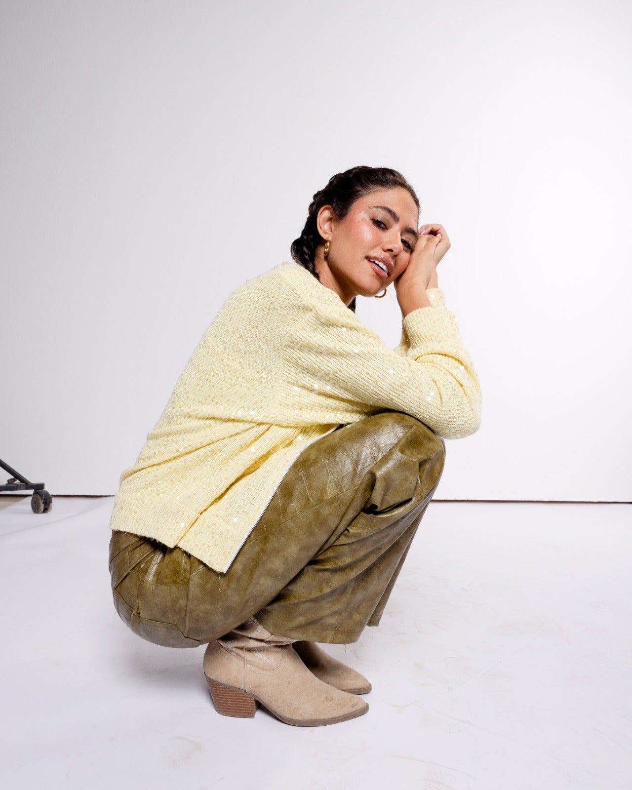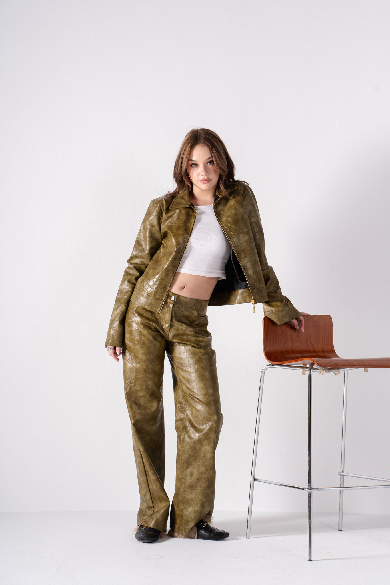 These bold leather pants feature a striking texture and a long, straight-leg fit designed to elongate your silhouette. The low-rise waist and subtle sheen bring a confident, edgy energy to any statement look. Available in both Brown & Olive