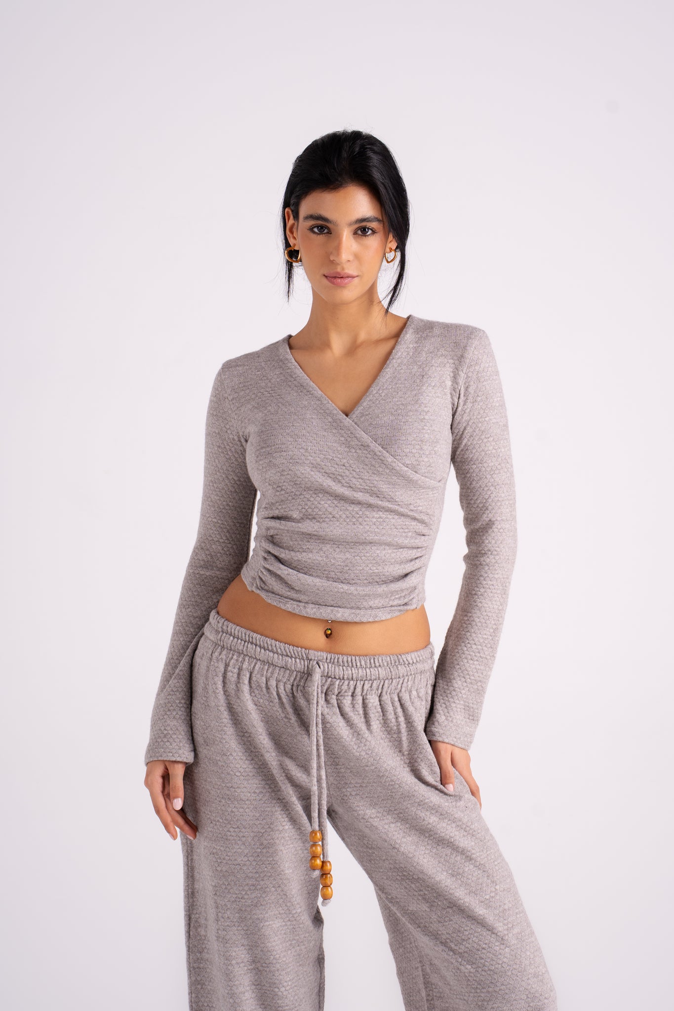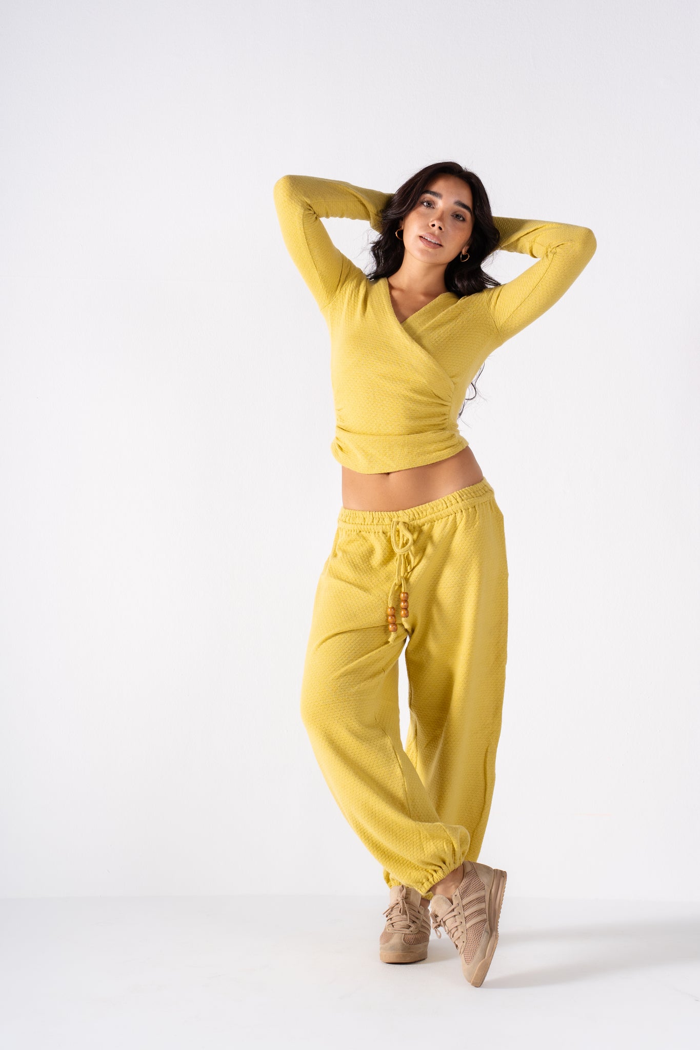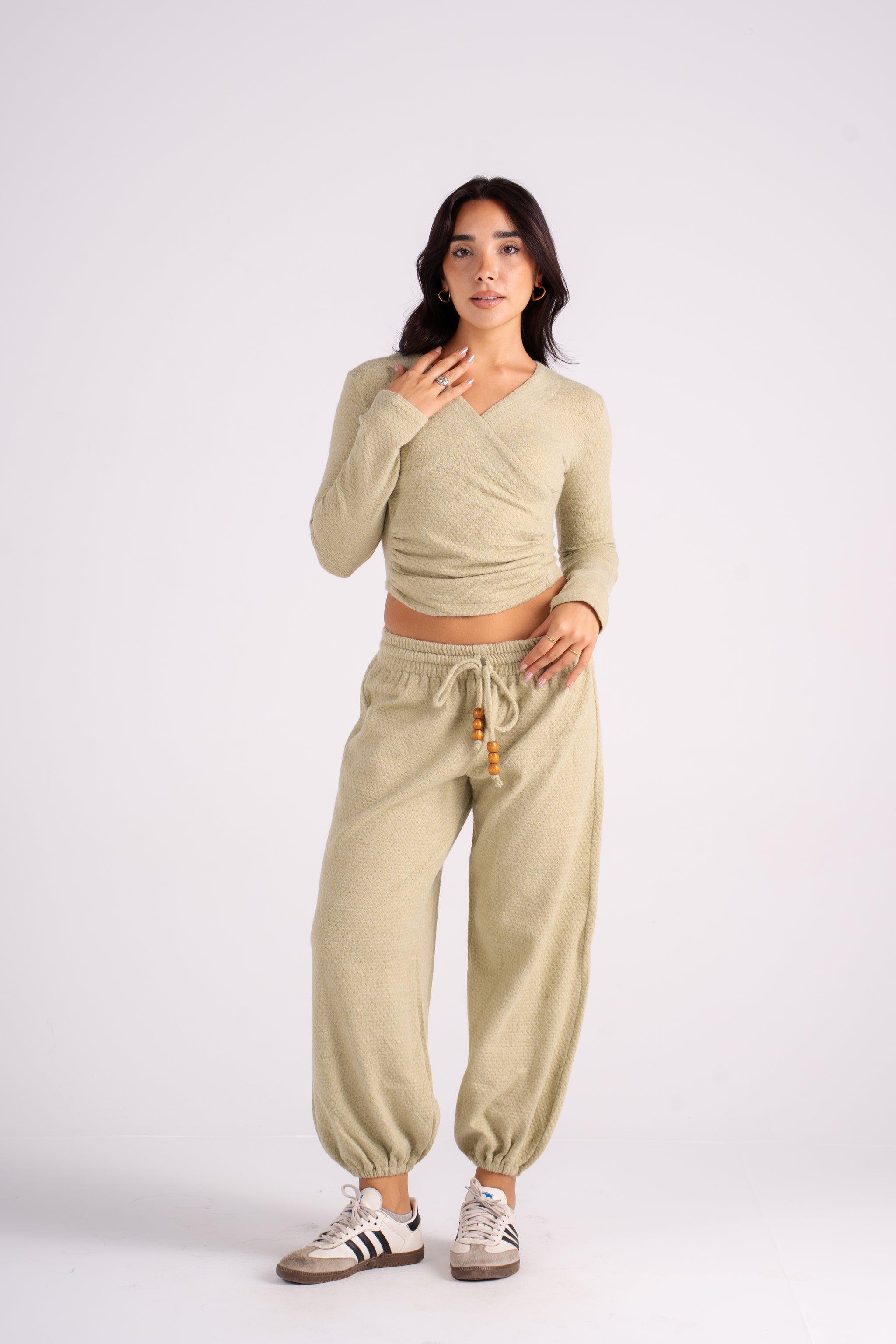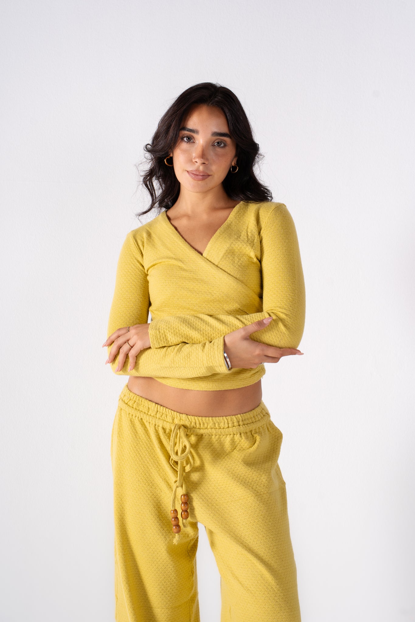 The Popcorn Set features a soft texture and a flattering wrap-style top paired with cozy drawstring pants. It's the perfect monochromatic look that blends effortless comfort with bold, vibrant color. Available in 5 colors.