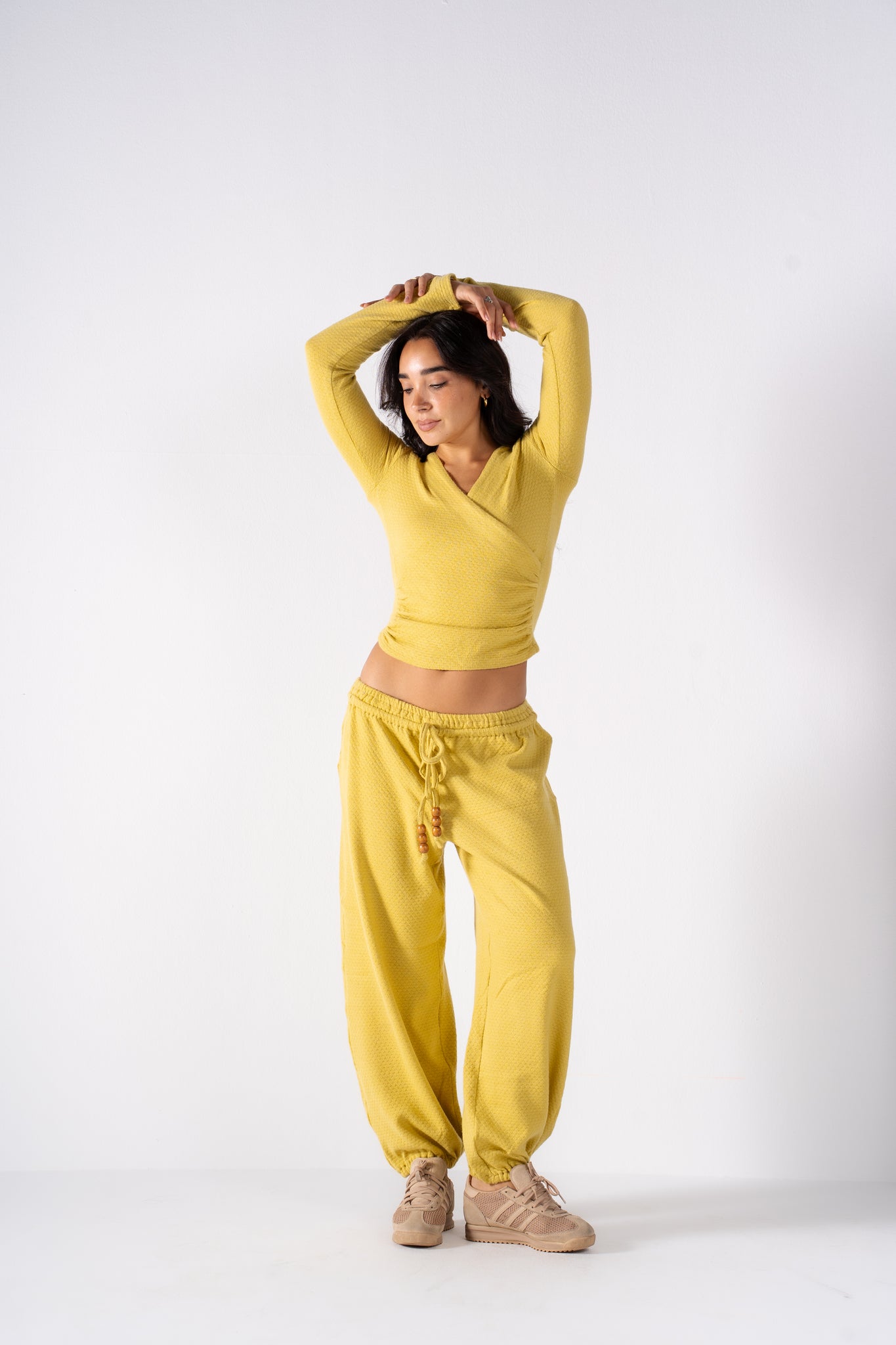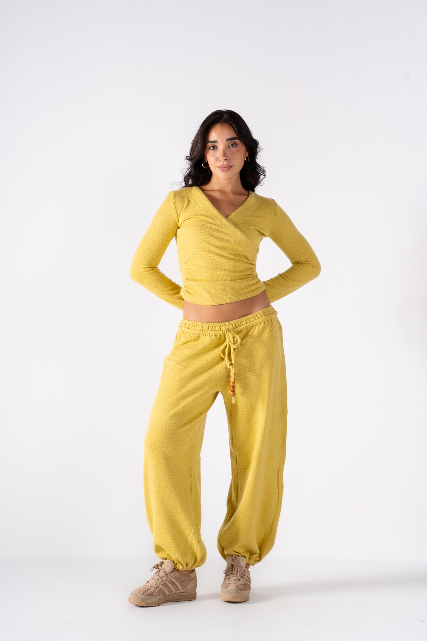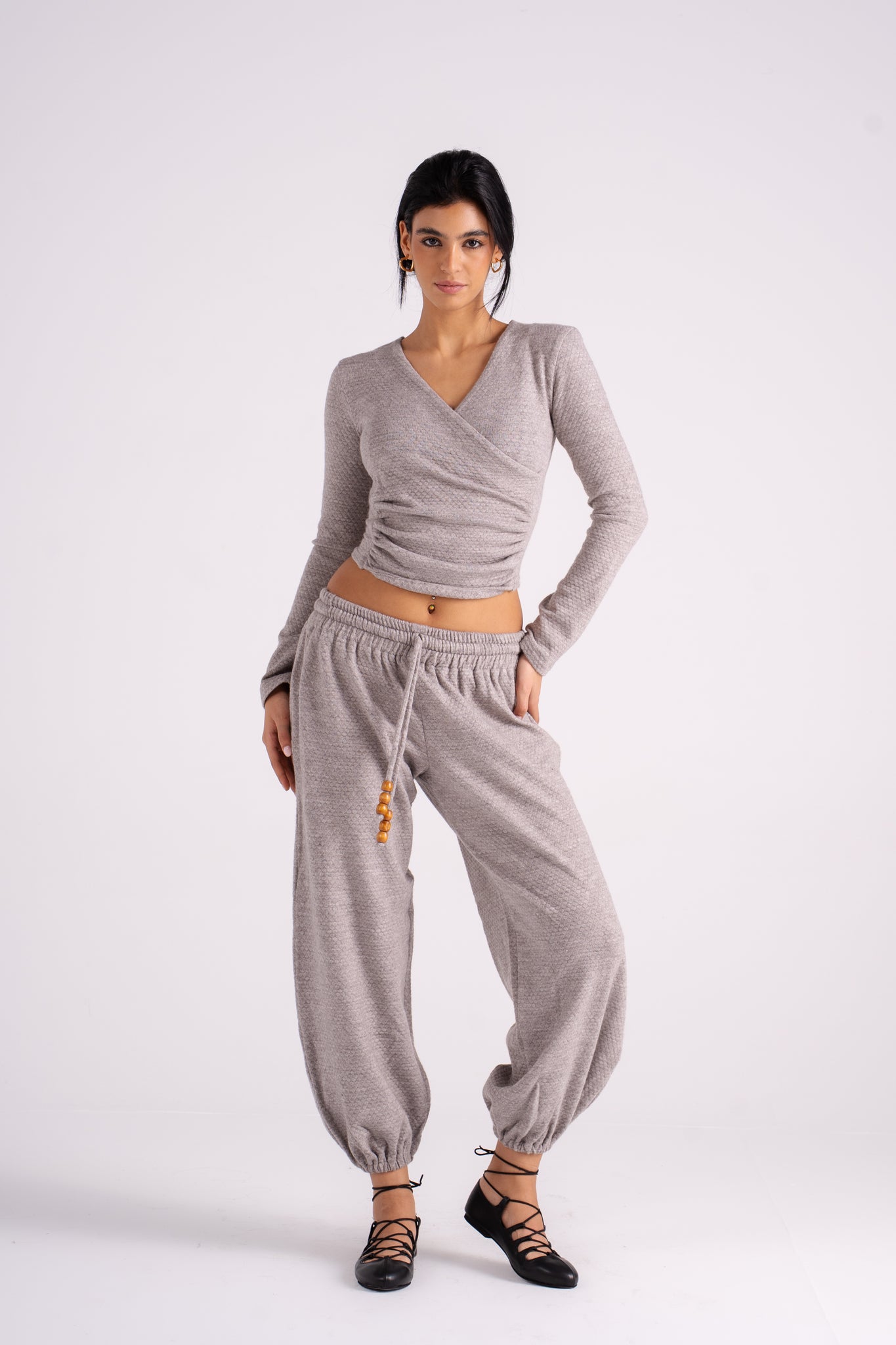 The Popcorn Set features a soft texture and a flattering wrap-style top paired with cozy drawstring pants. It's the perfect monochromatic look that blends effortless comfort with bold, vibrant color. Available in 5 colors.